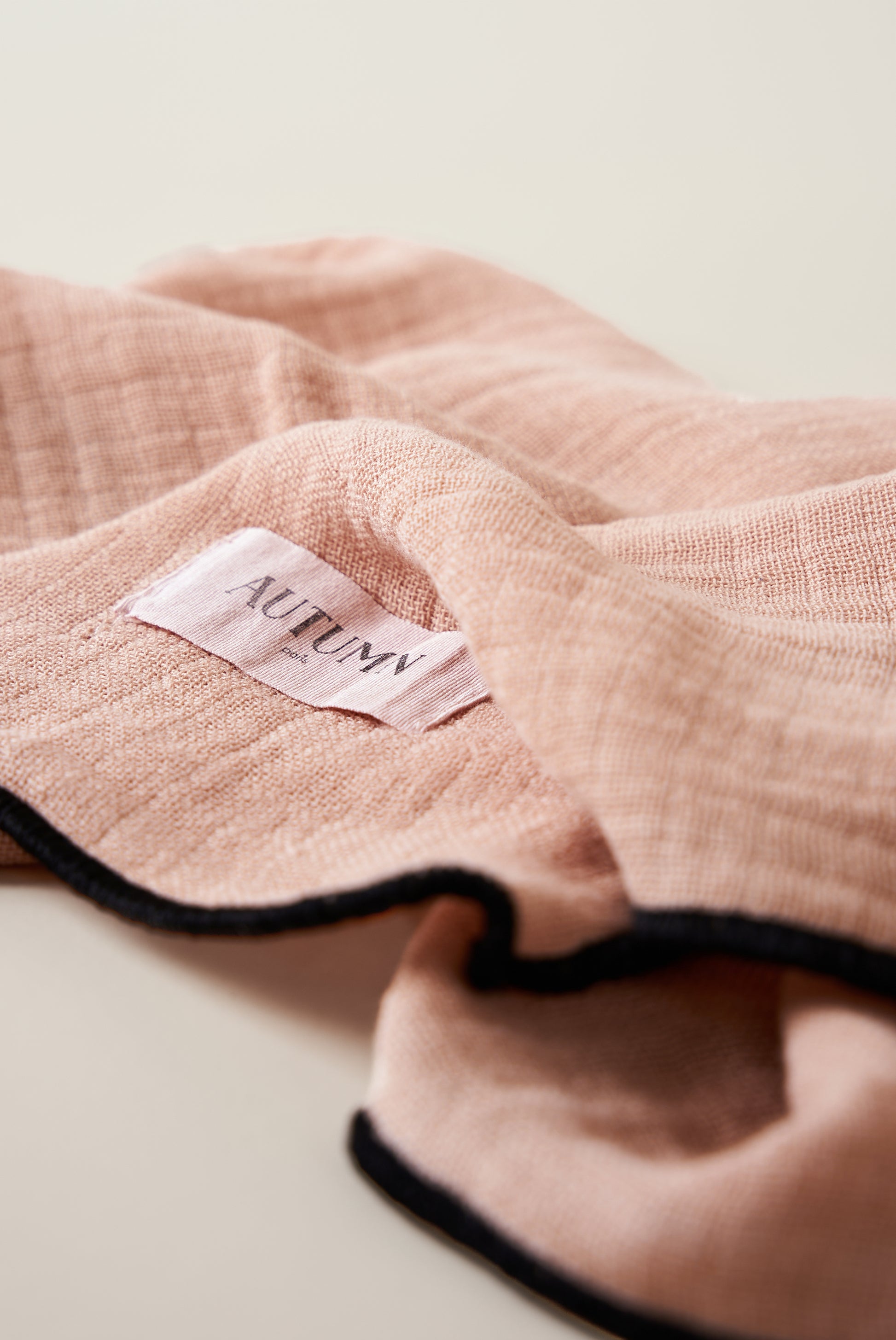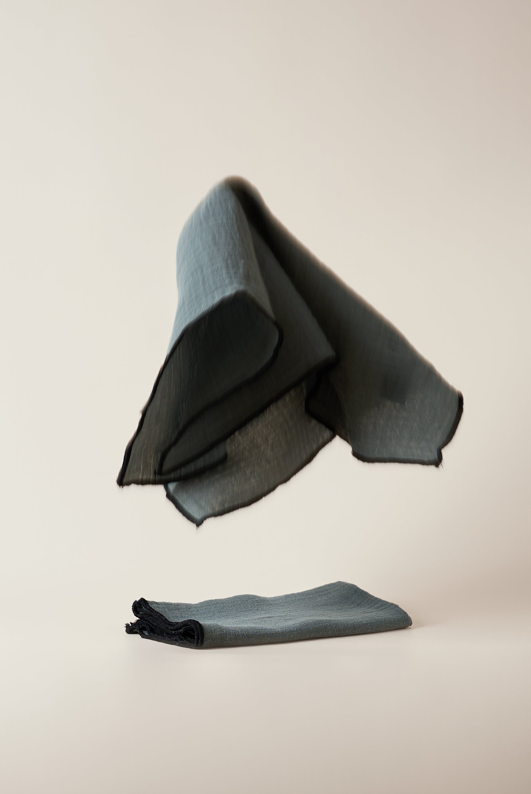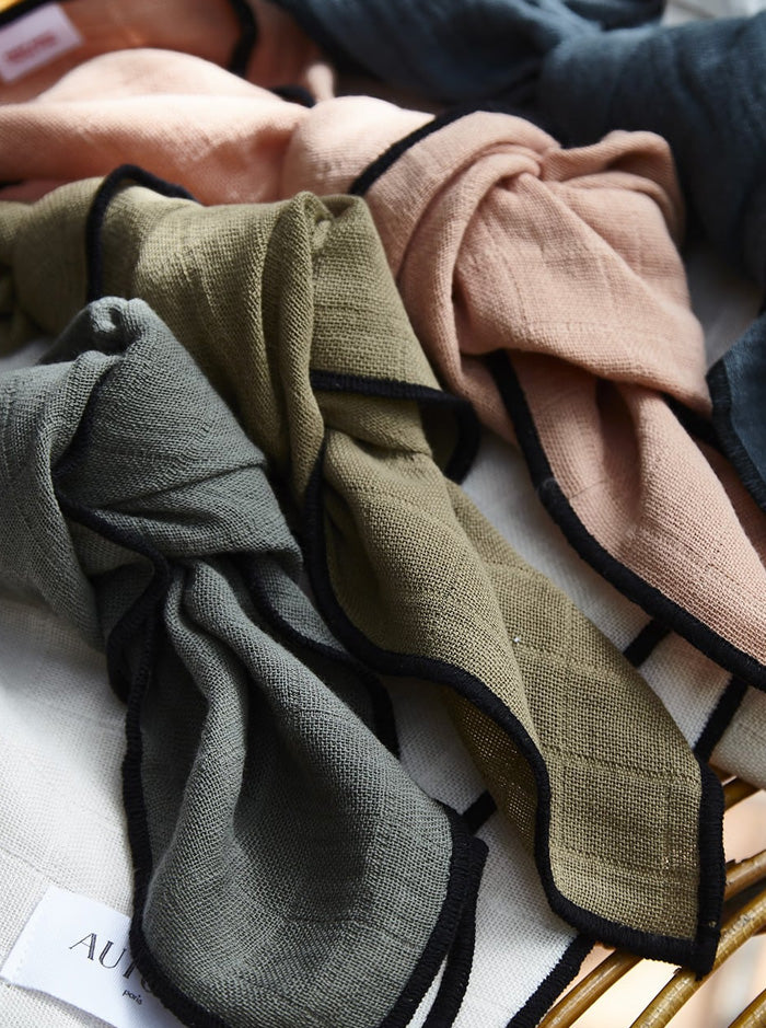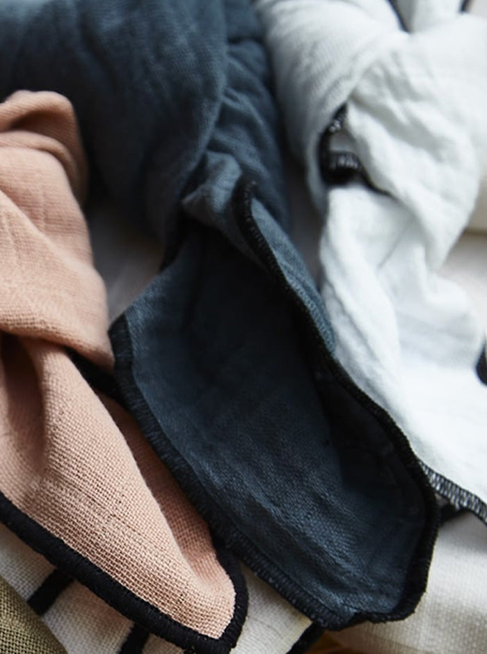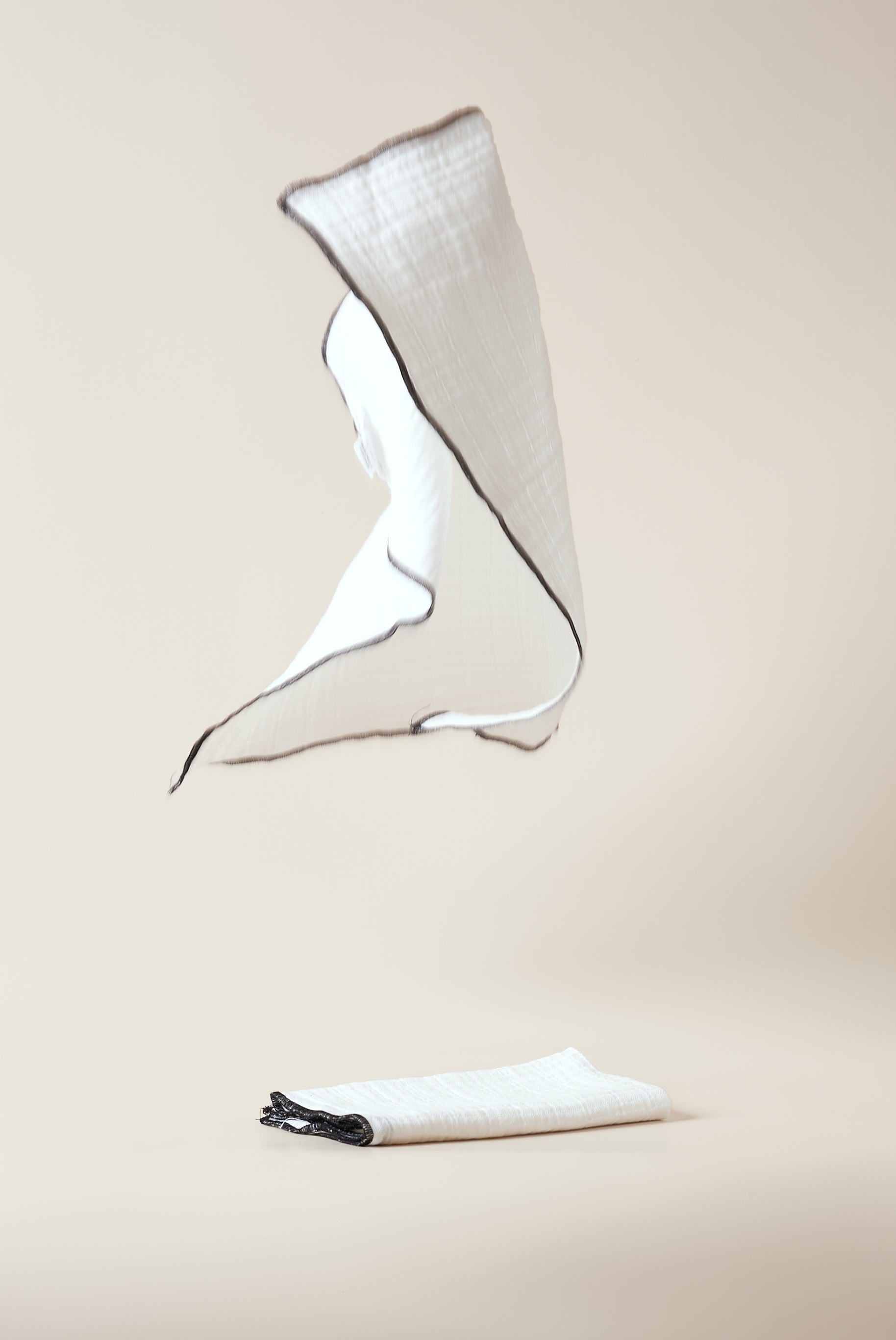 Ces serviettes de table en mousseline de coton ourlées de noir sont fabriquées au Portugal dans une petite usine familiale. Elles se lavent (40°C) et se sèchent en machine, le séchage leur donnera un côté gaufré champêtre.
