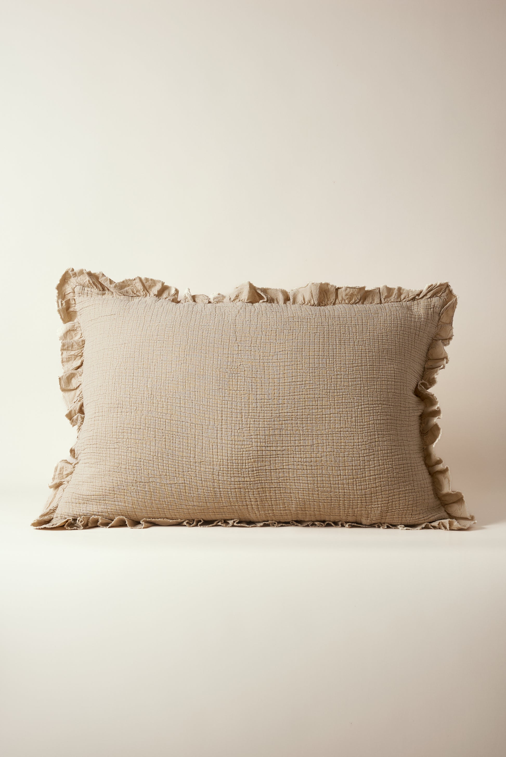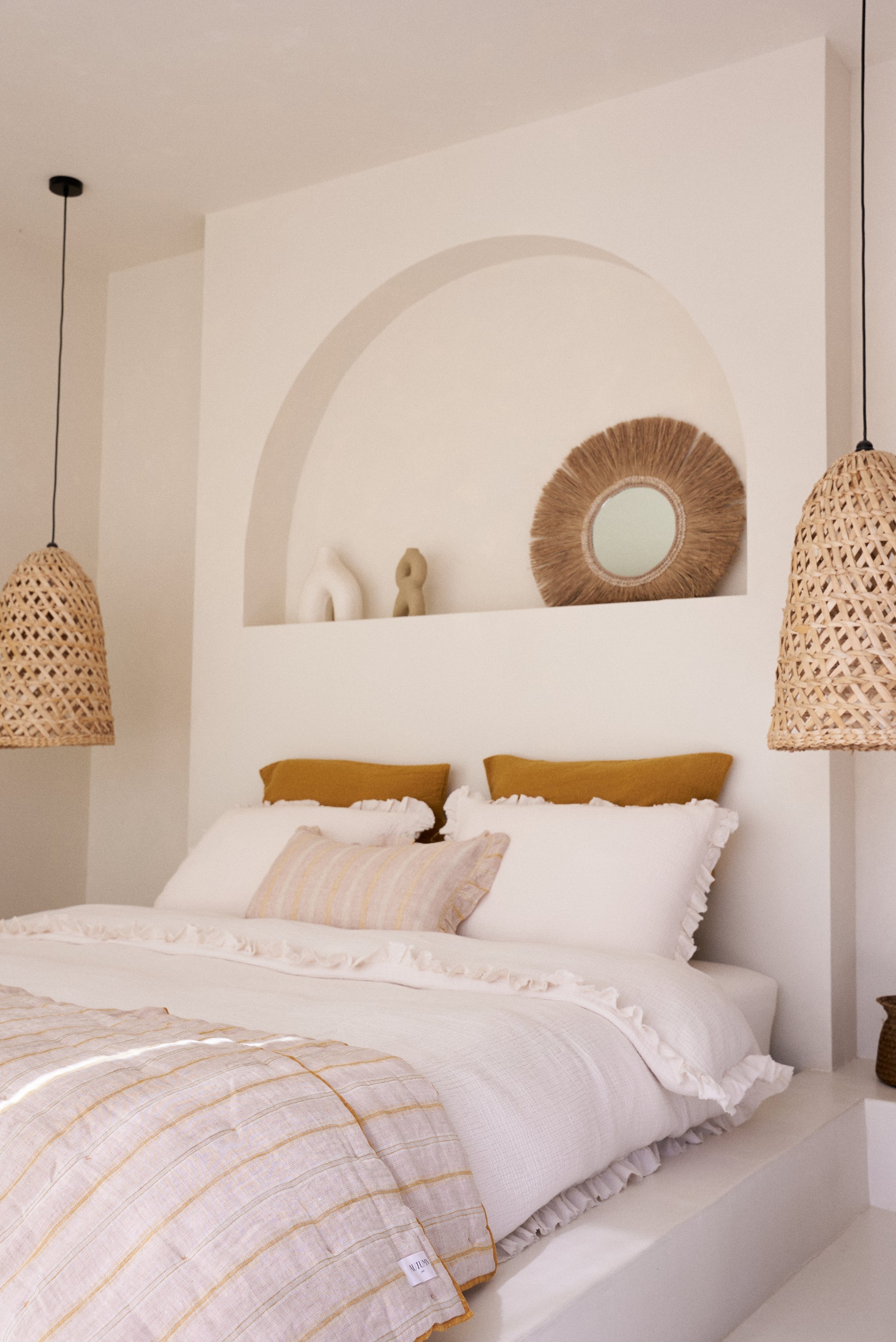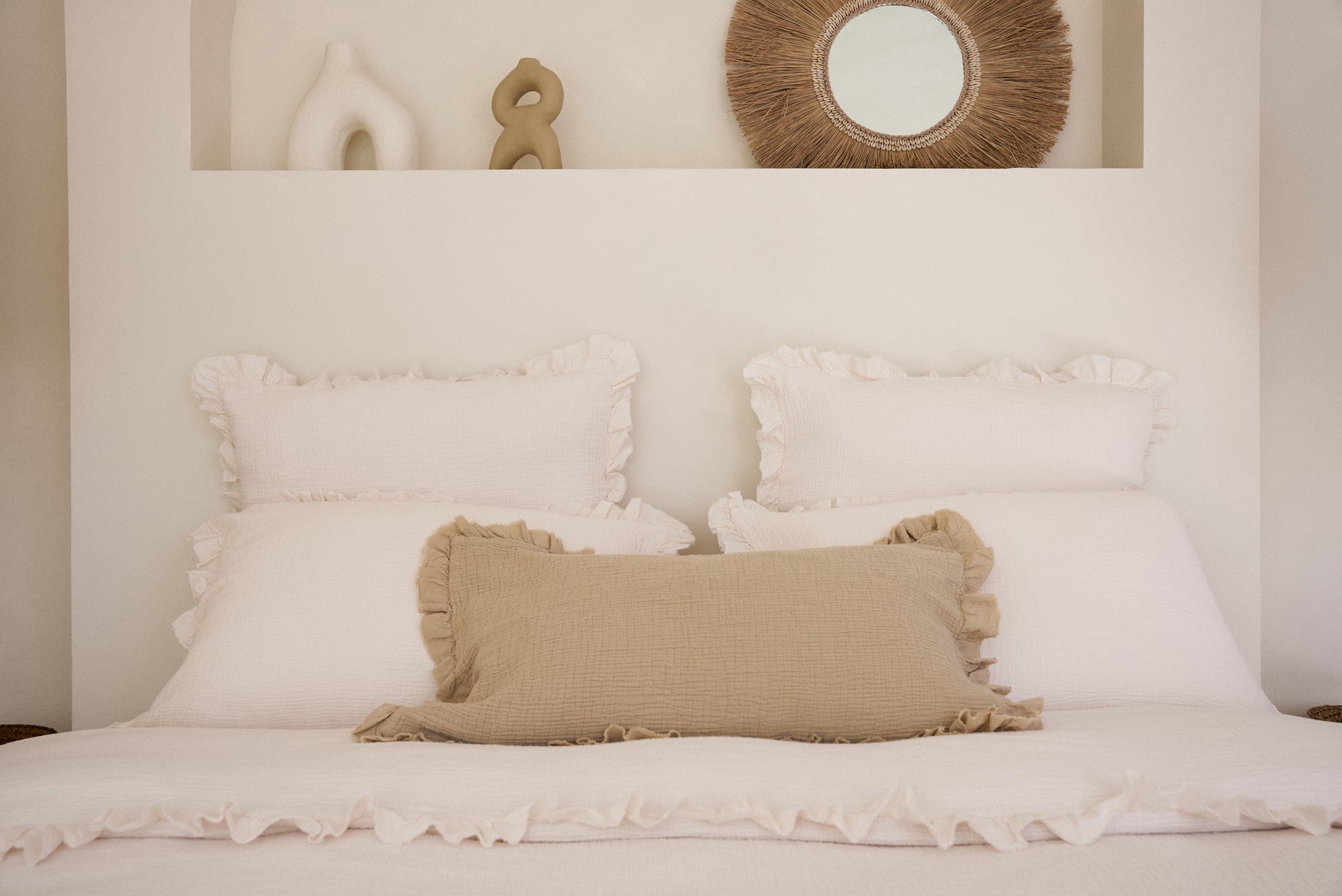 Inspirée du linge d’antan, la parure volantée enveloppe la chambre d’une douceur romantique et intemporelle. Son esprit bohème et délicatement froissé capte la lumière et raconte les nuits paisibles, bercées par la brise du matin.